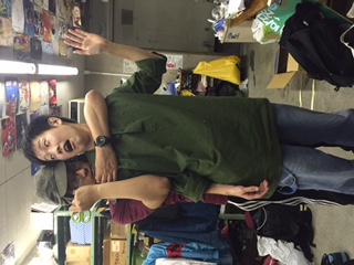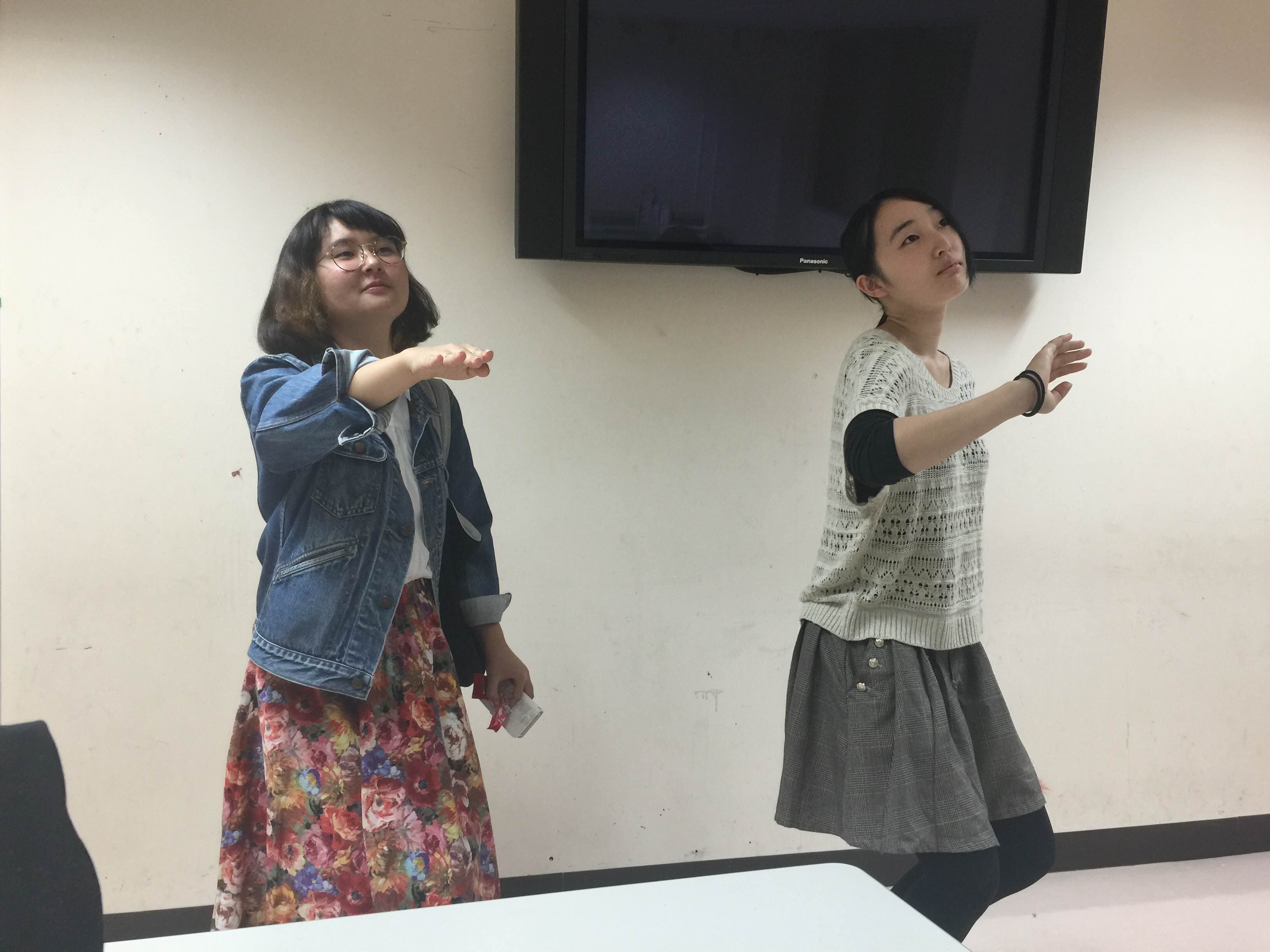 写真は帰り際に謎ポーズをキメる、照明班の上野なっぱ(右)と金野のんき(左)です。。。。