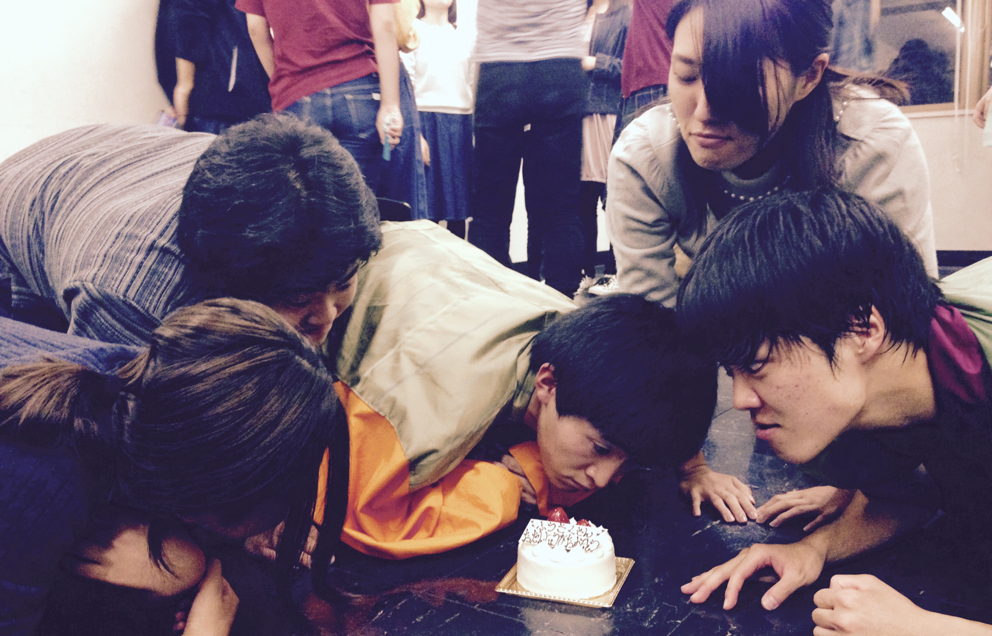 写真はこの公演を支える演出補助・今鹿氏の誕生日を祝う音響効果班の様子です。誕生日ってやっぱり素敵ですね〜♪