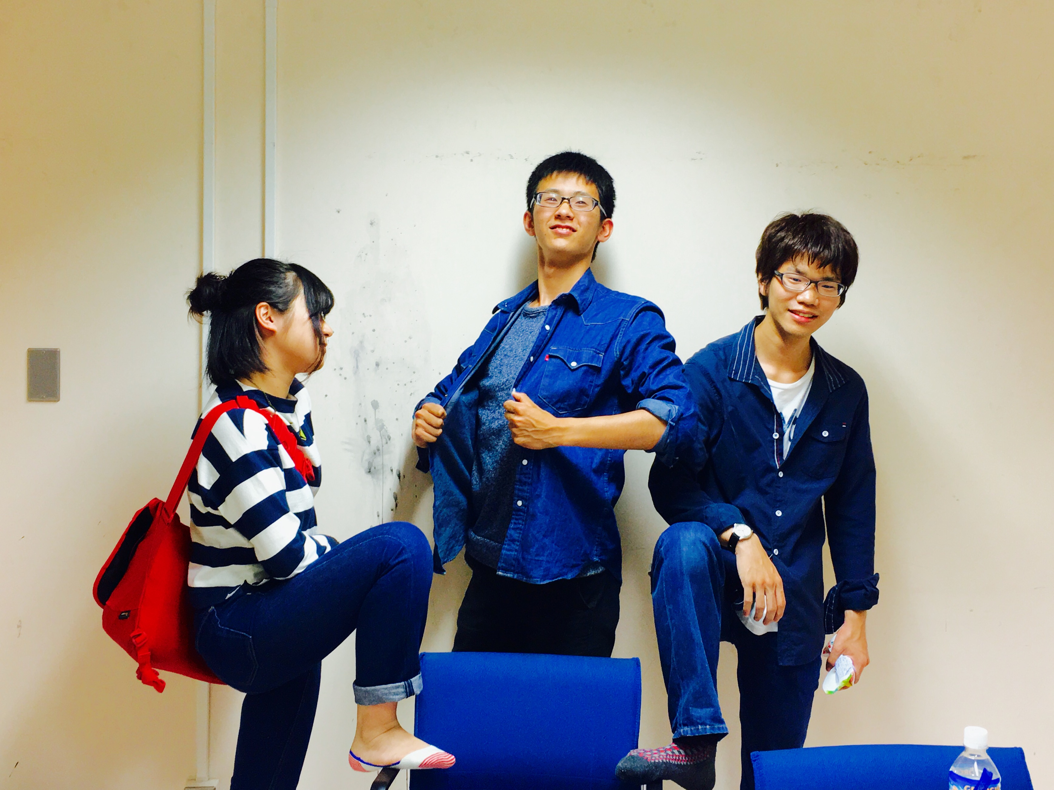 皆様お久し振りです! 約半年ぶりに登場、遂に3回生になりました。衣装小道具班の針村奏(そう)です。 いやぁ、半年って結構長いんですよね…。 古巣に戻ってきたら、 きらっきらに光る1回生が増えてました(真顔)。 とっても可愛い(真顔)。 とっっっっっっても可愛い!!!!!! はい、重要な事なので二度言いましたよ(笑)。 今回から入ってくれた、白石ハルと夕立ルビー。可愛いです。そして、そんな2人が頑張ってくれてる姿が嬉しい針村でございます。 今回の衣装班は、柊ジミーを筆頭にハルちゃんとルビーと私というメンツでして。 何でみんな下の名前カタカナなの…? という疑問はなきにしもあらず(笑)。 さぁさぁ、仲良くはりきって突っ走って行きますよ!! きらっきらの彼らの仕事ぶり、役者ぶり。是非とも会場へ観にいらしてくださいねヽ(*´∀`)ノ そんな仲の良い衣装班、最近度々服装がかぶります。ドレスコード決めたわけじゃないのにな…? 今回はデニム&ネイビー。そんな(右から)ルビー、ジミー、私。 本当はハルちゃんもデニムだったんですよ!